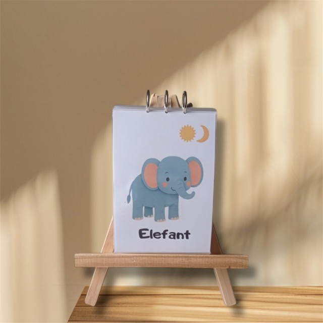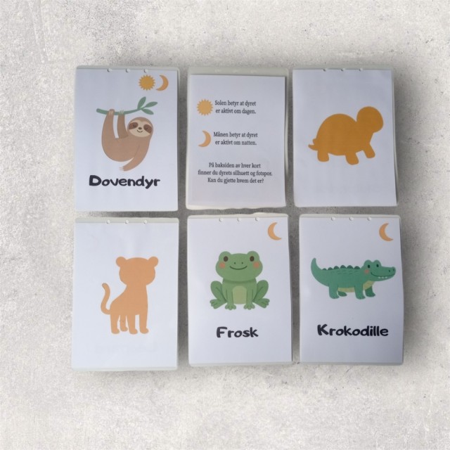 Dette settet inneholder tosidige aktivitetskort med flotte illustrasjoner av jungeldyr på forsiden og tilhørende silhuetter og dyrespor på baksiden.
