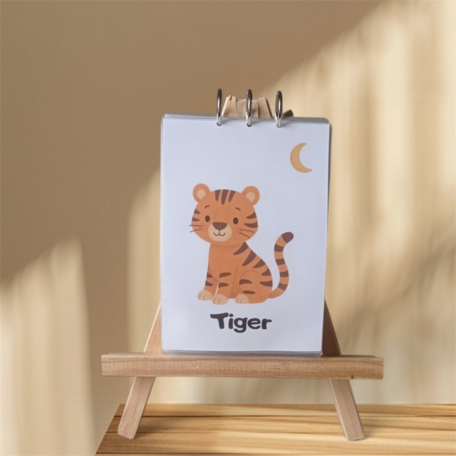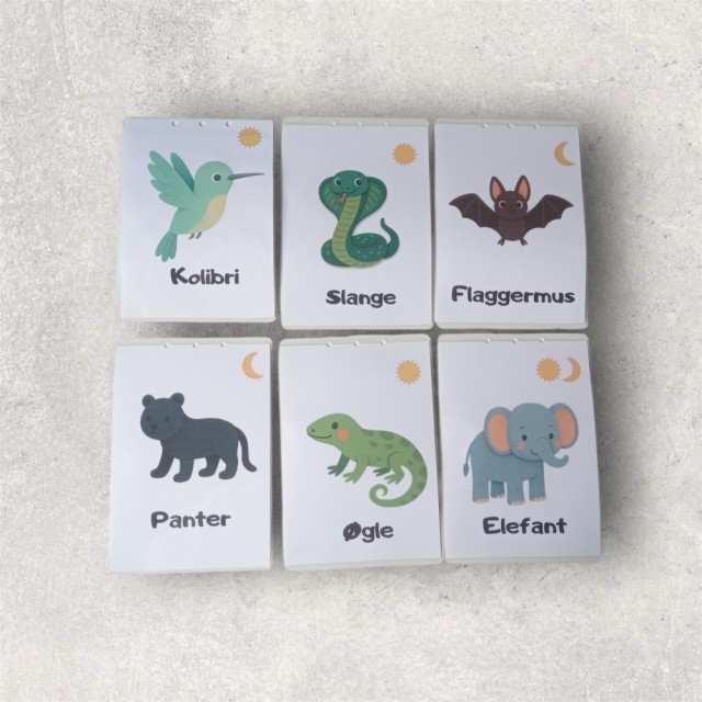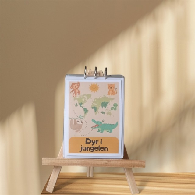 Dette settet inneholder tosidige aktivitetskort med flotte illustrasjoner av jungeldyr på forsiden og tilhørende silhuetter og dyrespor på baksiden.