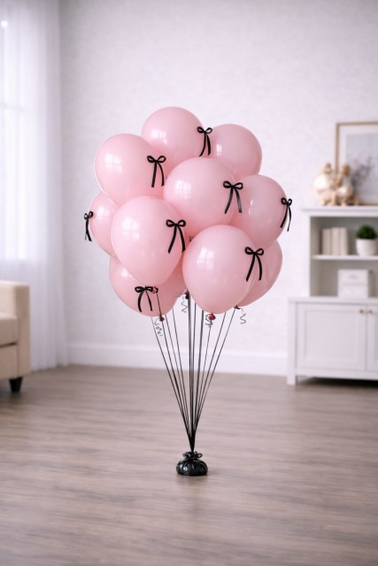 Elegant ballongbukett i myk rosa med stilrene svarte sløyfer – perfekt til bursdag, dåp eller fotografering.
